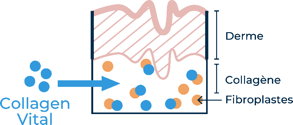 Le rôle de Collagen Vital Beauté est de reconstituer votre propre collagène et de restructurer votre derme en stimulant vos fibroblastes qui vont produire du collagène (+30% en 1 mois). Votre peau est régénérée de l’intérieur : elle est revitalisée, éclatante et ferme.