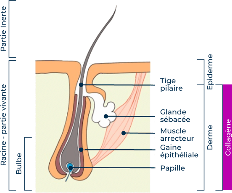 La gaine de collagène, protectrice de la fibre capillaire se raidit, comprime le cheveu et le rend plus cassant. Le cuir chevelu s’abîme, le cheveu pousse moins vite, perd du volume et devient sec.